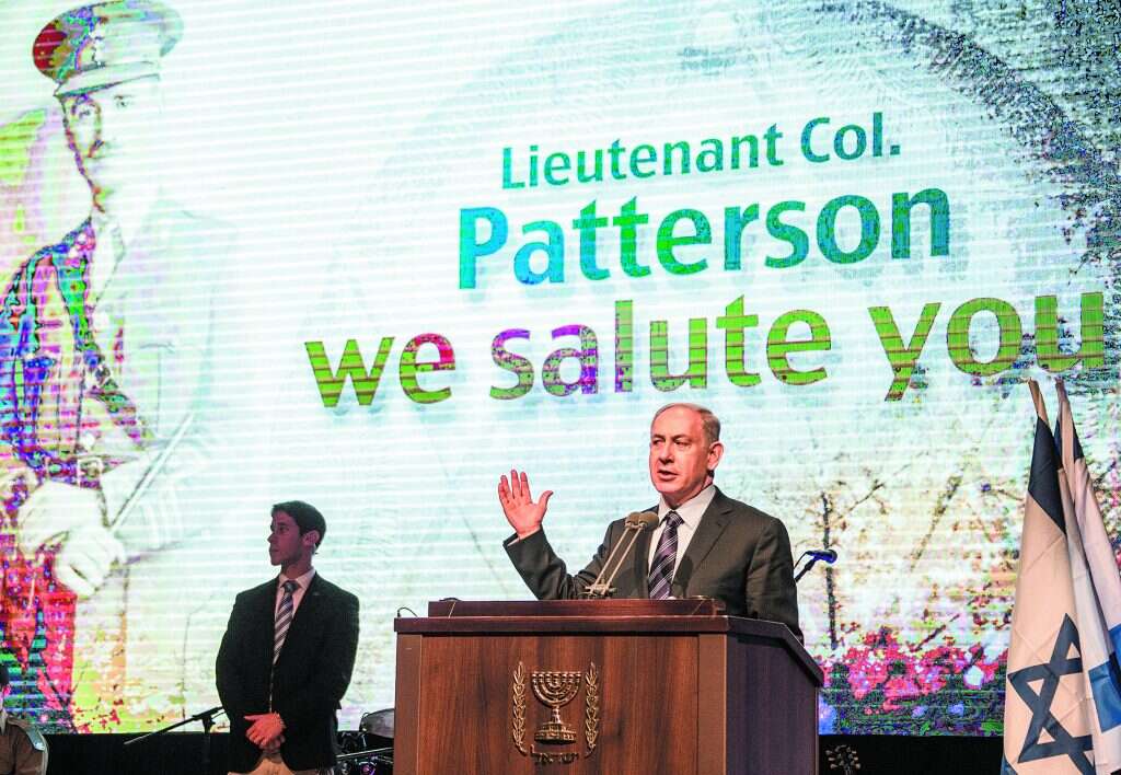 "פטרסון היה סנדק של יונתן נתניהו, שנקרא על שמו". ראש הממשלה, בנימין נתניהו, בטקס קבורת האפר של ג'ון הנרי פטרסון, בבית העלמין הצבאי בנתניה, 2014. צילום: AFP