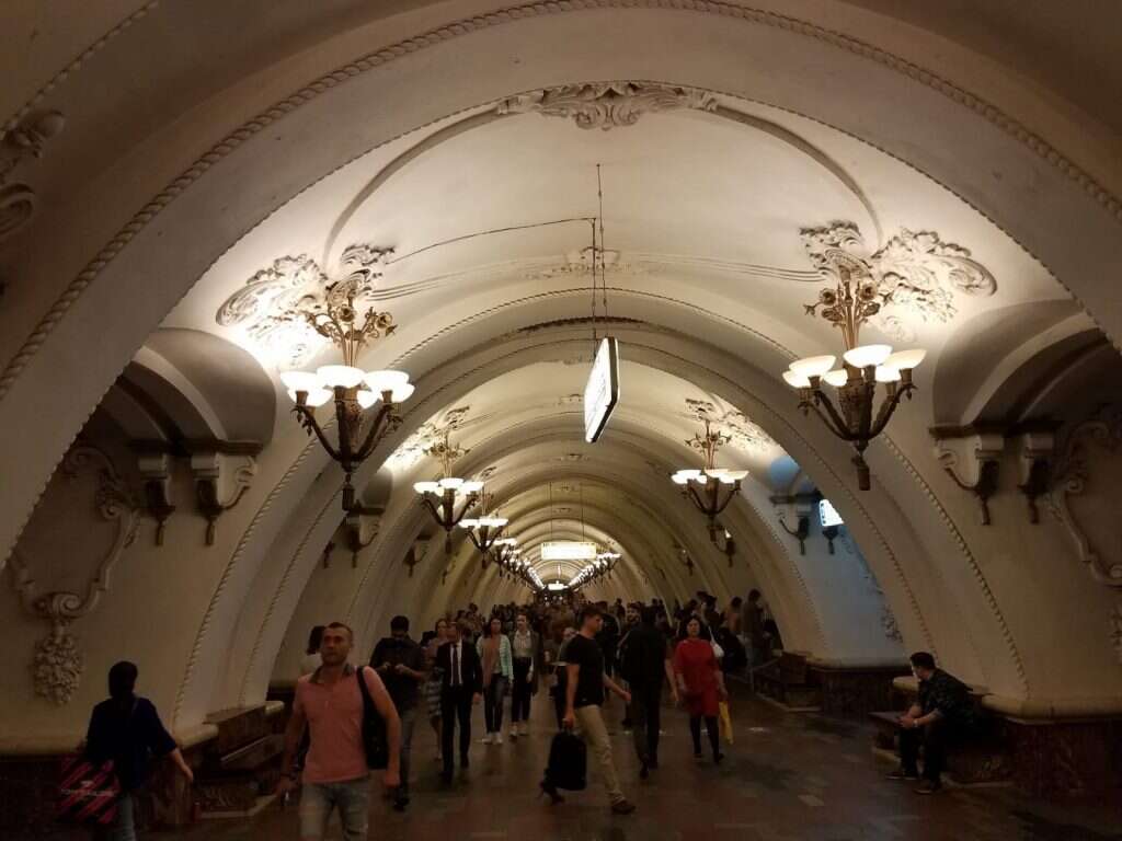 אם יש משהו אמיתי במוסקבה שראוי להערצה, הרי שזו הרכבת התחתית. היא נבנתה בשנת 1935, כל אולם יפה מקודמו ובעיקר – מגיעה תוך פחות משתי דקות. גם בשעות העמוסות שלפני ואחרי משחק, היא פשוט ממשיכה להגיע בדייקנות מעוררת קנאה. הדייקנות היא ערך כל כך עליון שהדלתות נסגרות באופן ובעוצמה של גיליוטינה, כך שאין טעם לרוץ לרכבת ולהסתכן במעיכה, במיוחד כשתוך שתי דקות תגיע אחת נוספת. וכדי שתבינו את סדר הגודל והעומק של המפעל הזה, קחו מספר: 2.5. בחלק מהתחנות לקח לדרגנוע 2.5 דקות להעלות אותנו מבטן האדמה ועד לפני הקרקע.