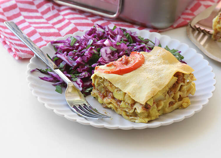 לזניית בשר עם טריק קטן שנותן לה תחושה קרמית, בזכות השימוש בכרובית הנטחנת לקרם חלק. שימוש מופרז בתבלינים חמים (כמו שאני אוהבת) לוקח את הטעמים למחוזות המטבח הים־תיכוני ויוצר מפגש מסעיר עם עלי הלזניה.