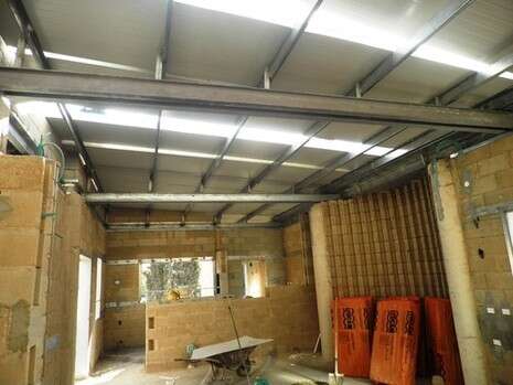 מקרוב, באור יום, הגג הזה לא נראה טוב יותר. אבל זו הסיבה שהוא עטוף במעקה גג, נסתר מעין. סביב הגג, על המעקה, יבואו פלאשונגים, רצועות מתכת בצורת האות "נ", אשר ייפרשו לאורך הקירות, וימנעו חדירת מים בין הקיר לגג.