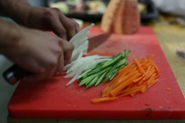 את הגמבה הצהובה + אדומה, גזר, בצל ירוק וקולורבי חותכים לרצועות דקות