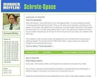 מידת עדכון: הבלוג הוקם עם תחילת העונה השנייה, אך לאחרונה מתעדכן בתדירות נמוכה להכעיס. רק שלושה פוסטים הועלו מתחילת 2007. באחרון שבהם מתנצל דווייט על החופשה הארוכה שלקח מכתיבה ומבהיר "אתם בטח תוהים מה עשיתי כל הקיץ. תשתקו. זה לא עניינכם".