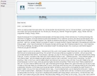 מרג'ין הפמן, הצעירה בביצ'ז של ביל הנריקסון, חולקת חוויות מעולם הפוליגמיה עם הרשת ולא חוסכת בפרטים, מה שאומר פוסטים ארוכים ומייגעים יותר מפרק של "אהבה גדולה". הטון אישי מאוד ונגוע בתמימות הילדותית והמעצבנת של הדמות. "אני לא מצליחה לספק את ביל מינית", היא מתוודה באחת הפעמים. "לפחות לא בזמן האחרון. אלוהים, בבקשה שזה בגלל הלחצים שלו בחנות. ובבקשה שזה קורה גם בלילות של ניקי ובארב. אוי, רגע, אני לא באמת מתכוונת לזה". הבלוג, שהפך די מהר פופולרי בקרב מעריצי הסדרה, פוליגמיסטים אמיתיים ושאר משועממים, הופיע יומיים לפני עליית הפרק הראשון של "אהבה גדולה" ב-2006 כיוזמה של הכותבים, שרצו לתת לקהל אפשרות לקבל תובנות עמוקות יותר על מרג'ין. בשנה שעברה, למשל, הם העלו כמה פוסטים שנכתבו כביכול ב-2003, והם מעין פלאשבקים לעברה של הדמות המתארים את יחסיה הבעייתיים עם אמא שלה. שאר הטקסטים כוללים בעיקר דסקוס נושאים שעלו בסדרה, פטפוטים משמימים על ילדים ובישול ומענה על תהיות הקוראים הדחופות, שמתובלים לעתים גם בספוילרים לעלילות הפרקים הבאים. הסיפור על נישואיה הקודמים של האחות-רעיה ניקי נחשף בבלוג לראשונה, וגם העובדה שמרג'ין ההריונית נושאת ברחמה בת.