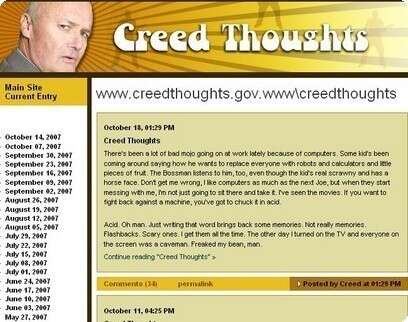 הבלוג של קריד ברטון, הבחור היחיד בעולם שמצליח להיות מוזר יותר מדווייט שרוט, התחיל כבדיחה באחד מפרקי "המשרד". בפרק קריד מבקש מריאן להקים עבורו בלוג, וריאן פשוט פותח לו מסמך וורד, מקליד למעלה כתובת אינטרנט פיקטיבית ומודיע לקריד שזה הבלוג. קריד לא שם לב שמשהו לא כשורה, ומתחיל לתקתק חומרים שריאן מגדיר כ"מזעזעים מדי אפילו בשביל האינטרנט". בבלוג האמיתי שלו הוא סולידי יותר, למרבה הצער, אבל יש ניצוצות בלתי נמנעים של טירוף. "הסתיו כבר באוויר", התפייט לאחרונה, "וזה אומר שבעה דברים: בחירות, יום ההולדת של לייל לאבט, החג ההוא שבו רוחות רפאים מקבלות ממתקים, אחד באפריל, קר מדי בשביל לשחק טניס, יש להיזהר מבואשים, והכי חשוב, בייסבול". רוב ההגיגים לא ממש קשורים לעלילה, לדמויות או לעולם באופן כללי, ובעיקר מתארים את המתרחש בתוך ראשו הפסיכופתי של הקריפר. מסקרן, תודו. "לפעמים כשאני חולה, או עצוב, אני שותה חומץ", הוא משתף. "אני אוהב את כל הסוגים: בלסמי, וודקה, מיץ תפוזים, עלים". "אתמול עשיתי תאונת דרכים ונמלטתי מהמקום", הוא מציין באדישות. "לא היה נראה שהמצב כזה גרוע. הבחור סתם עשה מזה ביג-דיל, אבל קאם און - כלבים לא חיים לנצח".