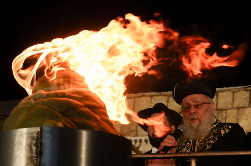 הראשון לציון הרב יצחק יוסף בהדלקה המסורתית במירון בל"ג בעומר. צילום: AFP