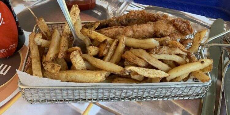 קודם כול, שאפו על ההגשה. הדג והצ'יפס הונחו בתוך סלסילת רשת אישית ממתכת, מעל נייר פרגמנט. אמנם לא הייתי מרחיקה לכת עד לכנות אותה "מנת שף", אבל בהחלט ניכרת השקעה. שני נתחי הדג (קוד, או בעממית "בקלה") היו גדולים ומשביעים. לא בטוחה לגבי מידת טריותם, אבל הם בהחלט לא היו יבשים וחוסלו על ידי במהירות. הצ'יפס הזכיר לי את הצ'יפס של סבא דוד. כלומר: זה עתה קולף, נחתך ונזרק היישר אל סיר שמן עמוק. הוא אמנם רך ושמנוני להחריד, אבל אין ממכר ממנו.