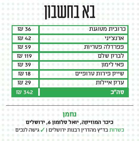 בשנים האחרונות ירושלים עוברת לא פחות ממהפכה קולינרית. מ"אנה", דרך "עפאים" ועד "02", יותר ויותר בתי אוכל עדכניים, מקוריים ומהוקצעים תופסים מקום של כבוד בבירה. שחקנית נוספת שאחראית על הגדלת היצע המסעדות בעיר היא כיכר המוזיקה, שהוקמה על ידי המיליארדר הצרפתי הדתי לורנט לוי ברובע ההיסטורי של נחלת שבעה, ומאכלסת לא פחות משש מהן. הגענו אליה באמצע יום עמוס בפגישות במרכז העיר וכמו במטה קסם, מרגע שפסענו אל רחבת הכיכר, המולת הרחובות הסואנים הסמוכים נמוגה. על הבמה המרכזית ניצב לו זמר אלמוני שפרט על הגיטרה שירי פולק אמריקניים, ברקע נשמע קול פכפוך מים מן המזרקה, הבריזה הירושלמית עשתה את שלה וכל שנותר לנו הוא להתעצב על כך שקונספט הפיאצה לא תפס כאן יותר.