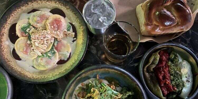 התחלנו עם קוקטיילים שכללו נגרוני חביב (האח הגדול והמריר של האפרול שפריץ) ומוחיטו ג'ינג'ר כיפי. המשכנו עם קובנה, שהייתה יותר לחמנייה משוחה בשמן מאשר מאפה הבצק התימני האהוב. ליוו אותה כמובן הצמד המתבקש – רסק עגבניות וסחוג ירקרק, ואליהם צוותה שמנת חמוצה, שפחות עבדה. לאחר הפתיחה הצולעת, הערב המריא באופן בלתי צפוי. עלו ובאו: סלט של פרוסות דקות ורחבות של זוקיני נא עם עלי נענע שהקפיצו ורעננו את המנה, וקרם פלפלים וצנוברים עטף את הירוקת. משם המשכנו לסביצ'ה פשוט מושלמת שעשו בה הכול נכון – משחק מדויק בין מרקמים, טעמים וצבעים של קוביות בס ואננס, קראנץ' מבצלצלי שאלוט, כוסברה ונענע ורוטב חלפיניו מהמם חושים. גם השווארמה דג הייתה מוצלחת וחריפה אש, עם המון־המון ירוקים, אריסה וטחינת יוגורט, והזכירה מנות מהמטבח הוויאטנמי.