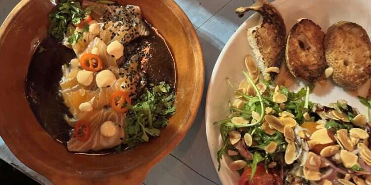 פתחנו עם סשימי מצוין של פרוסות סלמון נא שוחות ברוטב אסייתי מעדות הסויה פינת טריאקי, כוסברה ושומשום שחור וממעל נקודות של איולי צ'יפוטלה ופרוסות צ'ילי אדום. טרי ומרענן, מליחות וחריפות משמשים בערבוביה מופלאה.