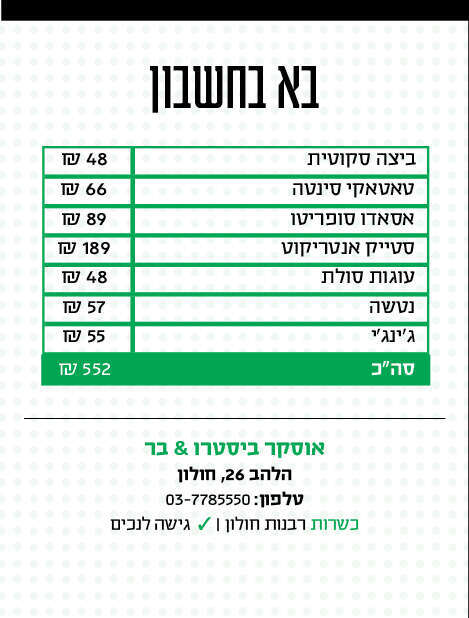 בישראל כמו בישראל, לא כל ביסטרו בהכרח עונה להגדרות האלו, ונדמה כאילו המושג הושאל באופן חופשי ומשמש בעיקר לתאר מסעדה בדרג ביניים. קצת יותר ממסעדת פועלים, קצת פחות מקולינריה גבוהה. כזו היא "אוסקר ביסטרו&בר" שנפתחה לאחרונה מחדש בחולון, כולל אפילו תפריט שמודפס כולו על גבי עמוד אחד, כמקובל בז'אנר. השעטנז בין הביסטרו לבר (עוד נוהג ישראלי לחלוש על כמה שיותר סגנונות יחד כדי למקסם קהל) הוא כנראה גם פועל יוצא של המסעדה בגלגולה הקודם תחת השם "אוסקר ויילד", שתפקדה במשך שבע שנים כשילוב בין בר ספורט לפאב אירי.