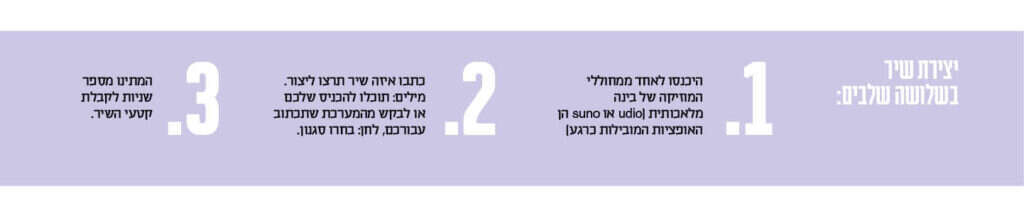 אז איך שיר נולד בעידן המלאכותי? הוא אומנם מתחיל מבפנים ומתגלגל החוצה אבל ההמשך קצת שונה. בשלב ראשון כתבו שורת הוראות הכוללת נושא לשיר וז'אנר מוזיקלי באחת מהפלטפורמות שתבחרו (לשם הניסוי מומלץ להזין את אותה שורה בכמה במות, התוצאות מעניינות), ואז אחרי מחשבה קצרה של הבינה המלאכותית מתרחש הפלא ופתאום ההנחיה הכללית שניסחתם הופכת לכמה אפשרויות של קטע משיר. אחרי שתאזינו לרצועה תוכלו להתחיל לשחק איתה, לבקש מהמערכת שתוסיף פתיח, להגיד לה להמשיך את אותו שיר אבל בכיוון אחר, או לעודד אותה להוסיף עוד זמר בהמשך - ואין גבול באופק.