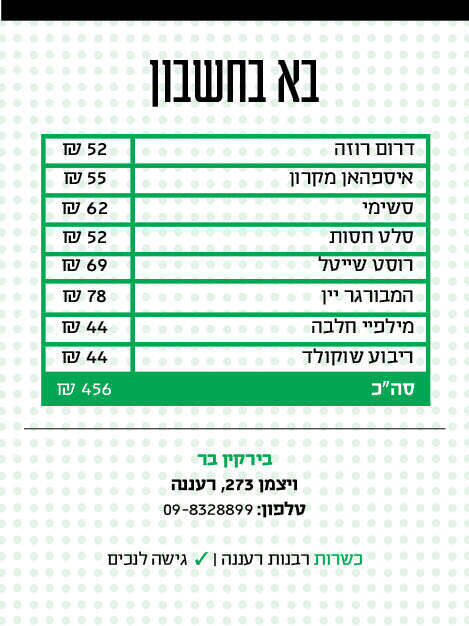 איך יודעים שטרנד תופס אחיזה והופך להיות יותר מגימיק? כשהוא יוצא ממרכזי הערים וכובש גם את הפריפריה. רבות כבר נכתב על ברי היין שפרחו בתקופת הקורונה, כעת, עם המציאות הביטחונית הלא פשוטה, עוד ועוד מסעדנים ממשיכים את המגמה של סגירת מסעדות ופתיחת בית אוכל שדורש מהם פחות סיכון. עם התבססות הז'אנר, גם התפריט עבר אבולוציה. אם בתחילה הוגשו בהם מנות נשנושים, בבחינת האוכל שליד האלכוהול, הרי שכיום משקיעים במזון לא פחות מבשיכר. זהו בדיוק מה שקורה ב"בירקין", בר היין שנפתח לפני כשלושה חודשים ברעננה וכבר מייצר סביבו באזז. המיקום הפתיע אותנו - במקום "סובב אחוזה" נבחר מתחם ווסט שסמוך לפארק רעננה. מצד אחד, אחלה ספוט לאכול בו לפני הופעה, מצד שני נוכחותה של תחנת דלק צמודה בוודאי אינה תורמת לאווירה.