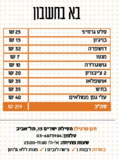 בשולחן לידנו יש ילד שעושה בלגן. המלצרית מגיעה אליו ואומרת לו "מי שמשתולל לא יושב פה", תוך שלוש שניות הוא משתתק ואמא שלו רוצה לקחת את המלצרית הביתה. עוד לפני הקינוחים אנחנו מלאי סיפוק, מלאי חוויה, מדושני עונג. משהו במסעדה הזאת הוא כל כך נטול גינונים, ואולי ההפך הגמור מהמסעדה ההיא בפריז. אבל אם תשאלו אותי לאן תמיד בא לי לחזור, אענה לכם שוב ושוב: ללא כל ספק, לכאן.