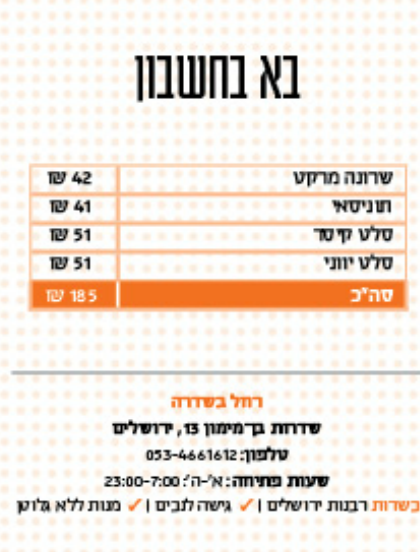 יש תפריט, ויש בו סנדוויצ'ים מוגדרים מראש, אך בראשם אפשר לבחור "רחל תכיני" - שזה בעיקר לאמיצים שסומכים על מצב רוחה של רחל ואוהבים הפתעות.