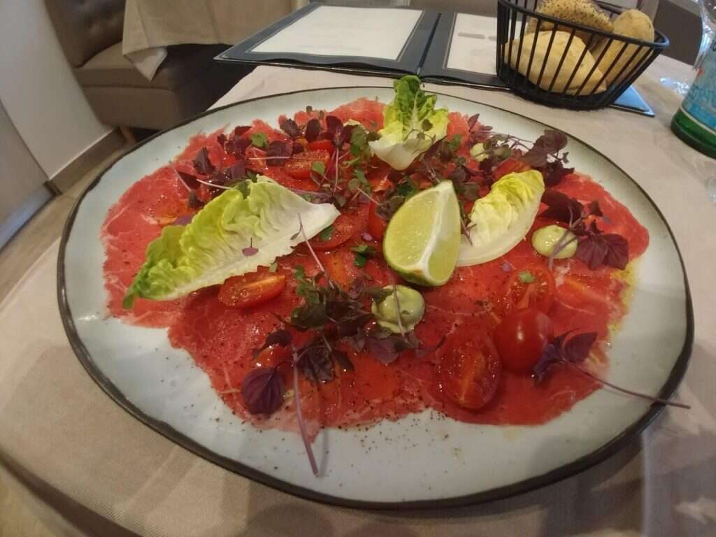 יאללה אוכל: הקרפצ'יו שהוגש כמנה ראשונה היה אדום, חי ובועט. התיבול לא הפך אותו לבורדו שחרחר, הטעם שלו וגם המרקם היה עז ובשרני. על הצלחת היפה פוזרו מספר תלוליות איולי מדהימות ועלי חסה רומית זעירים, שהיו פציחים ונעימים והיו הרבה מעבר להיותם כתם צבע ירוק בהיר על הצלחת הוורדרדה. פלח הלימון שצורף היה במקום, אבל קונסטרוקציית ירקות הקישוט שכללה פטרוזיליה רגילה וכהה ועגבניות מיקרו תמר – פחות. המנה הייתה כה טעימה עד שמצאתי את עצמי מסובב את הצלחת וגונב פיסות מהצדדים כדי שהיא לא תיגמר לי.