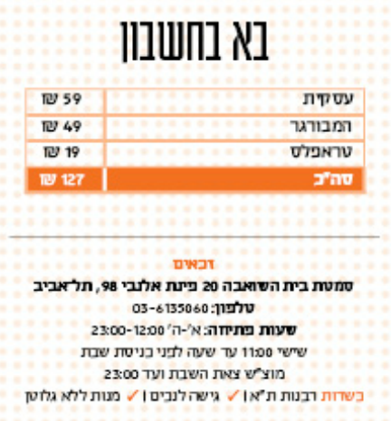 לאחר הפצרות מצד אבישג הצלמת, אני אוזרת אומץ ובוחרת ניוקי עם "שמנת" ופסטו בזיליקום. המלצר אומר שאין, ואני נושמת לרווחה והולכת על מסבחה טורקית והמבורגר (אם אין גבינה, לפחות שיהיה בשר).