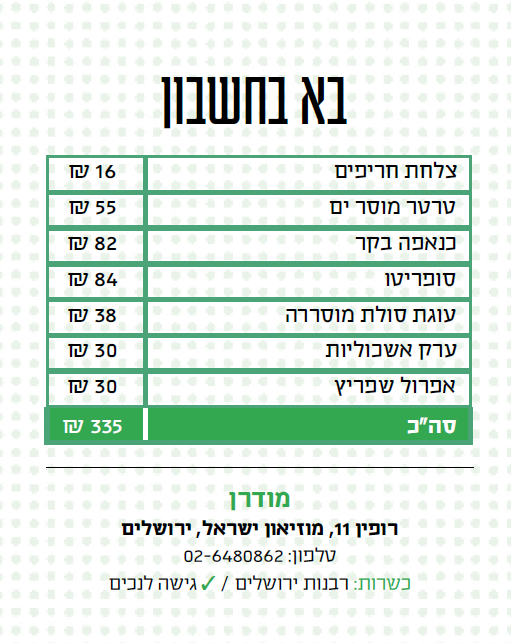 "מודרן" פועלת כבר כמה שנים במוזיאון ישראל, ומבקשת להציע פרשנות מודרנית למאכלים ירושלמיים שצמחו מתוך החומות. בעולם הקולינריה שולטות שתי גישות: האסכולה השמרנית שאוהבת את האנטריקוט שלה בדיוק־בדיוק כפי שהכינו אותו לפני מאות שנים, והאסכולה החדשנית שמשתמשת בטכניקות בישול חתרניות ויוצרת שילובים ייחודיים שלא נאכלו כמותם בעבר. באופן אישי, אני מבכרת את האחרונה. לקחת מנה עם טעמים של פעם, ללהטט עם המרכיבים ולהמציא אותה מחדש, זה בדיוק מה ששף טוב צריך לדעת לעשות. זו המהות שלו. כשזה מצליח, זה מסעיר ומרגש וכל מה שאפשר לבקש מאוכל, כך שבהחלט הייתי סקרנית לבחון את העבודה של שף ישראל בכר.
