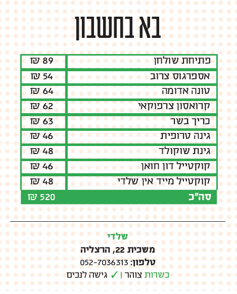סצנת האלכוהול בישראל מתחלקת לשניים - מקומות באוריינטציה פאבית עם נטייה לבירה, מזון מטוגן ואווירת חבר'ה, או ברים שמשדרים יוקרה ומציעים יין משובח ותפריט מוקפד. שניהם מייצרים חוויה של אסקפיזם, בשניהם כיף לבלות. עניין של טעם ושל מצב רוח. אין ספק ש"שלדי" (Sheldi), שנפתח בהרצליה פיתוח לפני כמה חודשים, משתייך לסוג השני (ולא להתבלבל עם בר ה"שלדון" שנמצא במתחם הבורסה). כמו רבים לפניו, גם הוא מנסה לפצח את נוסחת הקסם: צהריים לעובדי תעשיית ההיי־טק ביום, ומוקד בליינות לילי עם רדת החשכה. ד"ר עסקית ומיסטר קוקטייל.