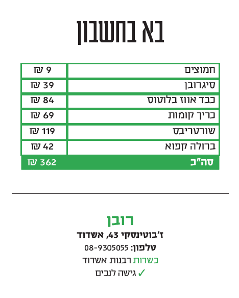 בזמן האחרון כולללם מדברים על "רובן". בניגוד למסעדות טרנדיות שנפתחות בקול רעש גדול, כאן מדובר במוסד קולינרי עם שורשים. "רובן" המקורית הייתה דֶלי אמריקני קטן בלב תל־אביב, מקום עם קהל מעריצים קטן אך נאמן, שידע להעריך כריכים עמוסי שכבות פסטרמה דחוסות בין שתי פרוסות לחם שיפון לבן. המבקרים היללו, הסועד הישראלי הממוצע קצת פחות. אחרי שהסניפים בהרצליה ובתל־אביב נסגרו, רכש היזם והשף בראל רז את הסניף החיפאי והחליט לחשב מסלול מחדש. המטבח נותר אמריקני, אבל עבר התאמה לחך המקומי. ומה יותר ישראלי מהמבורגר? כן, כן: פלאפל אולי נחשב למאכל הלאומי שלנו, אבל כל מי שמסתובב קצת ברחבי ארצנו הבחין שהוא כבר מזמן הוחלף בקציצת הבשר השמנונית. המבורגריות בכל הגדלים, הצבעים, התוספות והמחירים צצו בשנים האחרונות כפטריות (פורטבלו) אחרי הגשם.