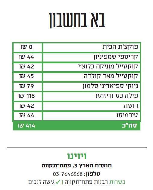 ואם כבר הזכרנו את פתח־תקווה - העניין קצת קשה לנו אז נאמר אותו בבת־אחת וזהו: בתקופה האחרונה אם המושבות הפכה למוקד קולינרי שכבר לא ניתן להתעלם ממנו. התרחבות אזורי התעסוקה של עיר השינה האפרורית הביאה איתה גם גל של בתי קפה חדשים, ברים מעוצבים ומסעדות קונספט מעניינות. כשהן מצטרפות למסה הקיימת, אין פלא שהאזור שוקק חיים מדי לילה, עם מקומות שצריך להזמין בהן שולחן שבועות מראש. כאמור, אחת מהן היא "ויוינו", שמגדירה את עצמה כ"מסעדה איטלקית שמחה". היא אמנם משתייכת לרשת ארצית, אבל פרט לסגנון העיצובי המעט־שבלוני, היא ממש־ממש לא נותנת תחושה כזו ומציעה מנות מקוריות ומבחר יינות וקוקטיילים.