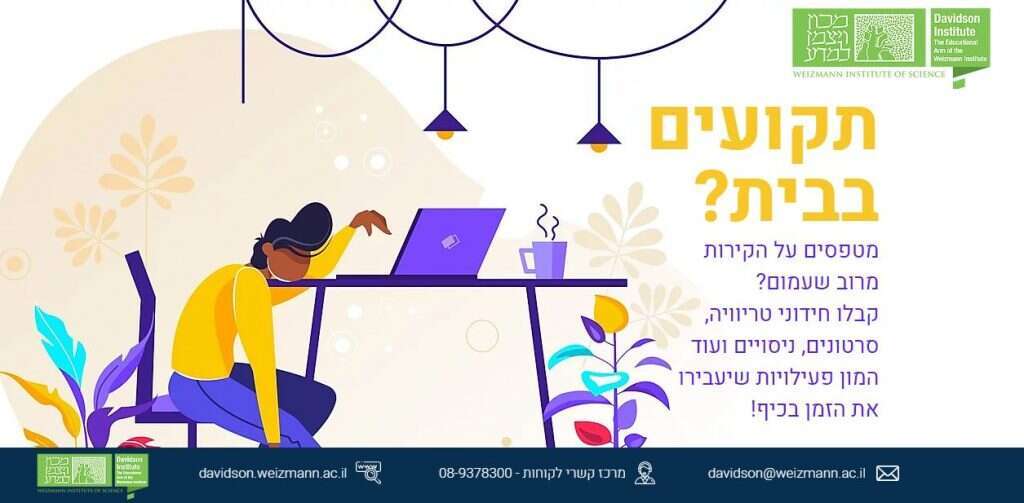 לחינוך מדעי מציע לקהל הרחב שלל פעילויות וירטואליות באתר הכוללים חידוני טריוויה מדעית, סרטונים, ניסויים, סרטוני מדע ועוד המון פעילויות שיעבירו את הזמן בכיף https://www.davidsoncourses.com/stuck-at-home