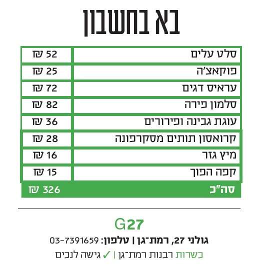 קינחנו בעוגת גבינה - תחתית של פירורי שטרויזל חמאתיים ומתוקים, גבינה עשירה וחמיצות פסיפלוראית ממעל יצרו קינוח מוצלח. דווקא הבחירה בקרואסון חתוך וממולא בקרם מסקרפונה ותותים, שכל כך פופולרית כאן, התגלתה כבינונית. סיום מעט מאכזב, שהרי בשביל מה באים למקום חלבי אם לא בשביל להתענג על המתוק־המתוק הזה. G27 נע בין מנות מופלאות של ממש לכאלה שזקוקות למקצה שיפורים. אולי זה הפיזור והרצון להיות "גם וגם וגם", אולי זו תקופת הפוסט־קורונה שגורמת למקומות עדיין קצת לחרוק. כך או כך - מדובר בתוספת מבורכת למאגר המסעדות העירוני שוודאי עוד נשוב אליה.