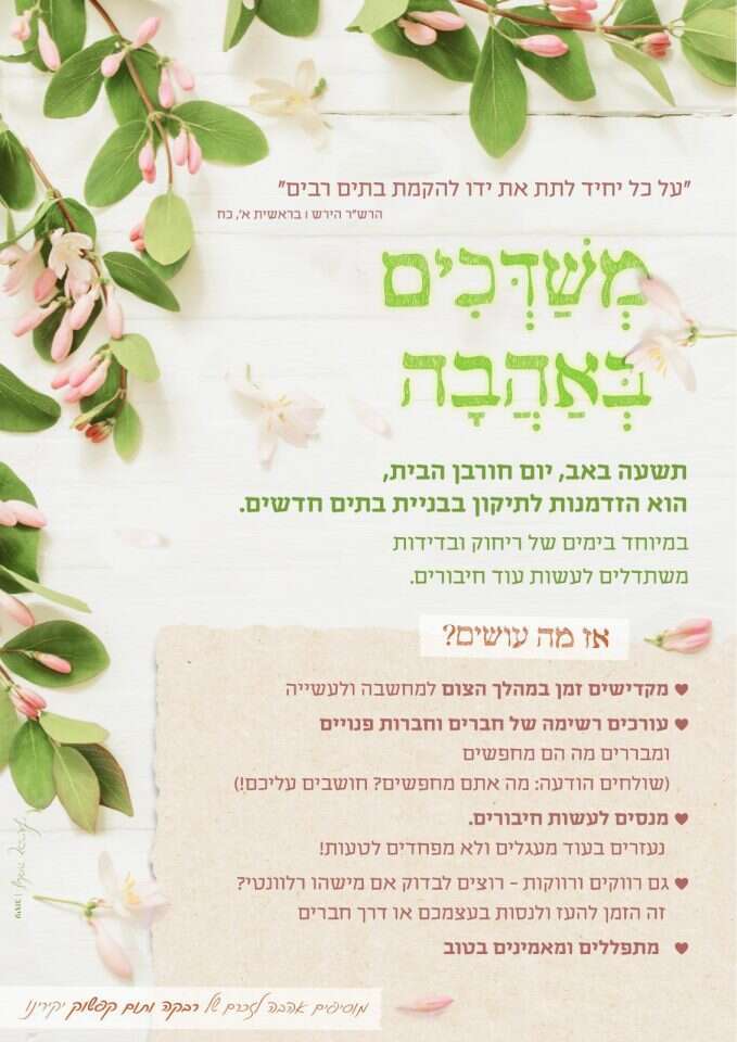 זו השנה השלישית שמיזם "משדכים באהבה" פועם בתשעה באב ומוסיף אהבה בעולם. ביום בו נחרב הבית ועלה בלהבות שנאת החינם אנחנו מבקשים לנסות ולבנות בתים, להצית אהבה בלבבות של מי שמחפש אחריה.