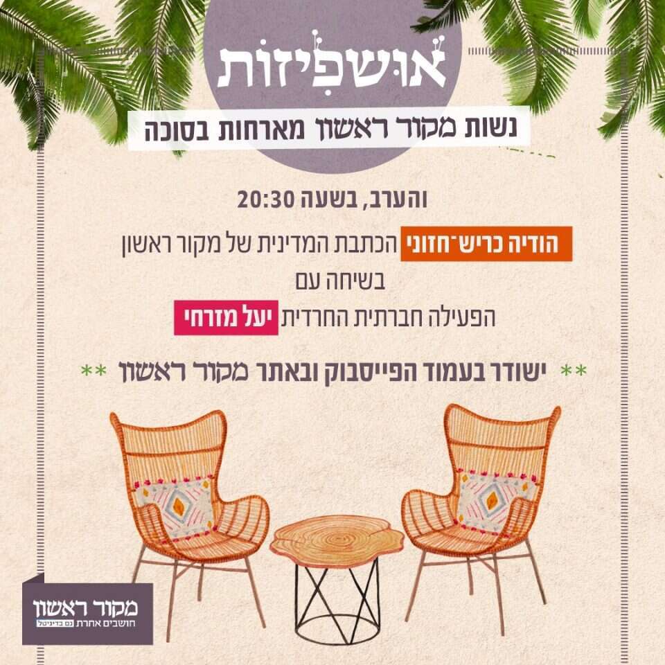 והערב: הכתבת המדינית של מקור ראשון הודיה כריש-חזוני בשיחה עם הפעילה החברתית החרדית יעל מזרחי. מוזמנים!