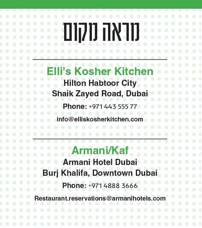 ומה לגבי אוכל כשר? העובדה שהישראלים נוהרים לדובאי, בשילוב המשבר הקשה שפוקד את עולם המסעדנות בארץ, קרצה ליזמים קולינריים, ותוך חודשיים בלבד צצו אפשרויות רבות למטייל המקפיד. מחברות תיירות שמכשירות מטבחים שלמים במלונות ועד לארוחות גורמה תוך כדי שיט על ספינת פאר. אפילו במאהל הבדואי שבו מבקרים כחלק מחוויית ספארי המדבר כבר ניתן למצוא ברביקיו כשר (ומי שלא חזה ב"מעמד שליפת העצם מהאסאדו" לא חזה בביזאר מימיו).