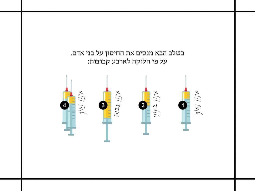 מאור פנים בכניסה למחלקה. על אחת הכורסאות נח משתתף אחרי חיסון, ומתאמות המחקר מקבלות את פניי בחיוך ובאמירת תודה שמביכה אותי. שוב בדיקות חום, לחץ דם, ריאות ולב, ואני מקבלת סיסמה לאפליקציה. מעכשיו בכל יום אצטרך לסמן אם יש לי בחילות, סחרחורות, חום, כאבי ראש, צרבות ותסמינים נוספים. המידע שהצטבר על אודותיי נשלח בינתיים למעבדה שנמצאת כמה קומות מתחתינו, וממנה תגיע הזריקה המיוחלת בתוך שעה. רופאים, אחיות ומתאמי המחקר שמסתובבים במחלקה לא יודעים איזה חיסון אקבל כדי שלא להשפיע עליי ועל המחקר, אבל הם כן מבשרים לי שאני מקבלת מנה אחת. אוקיי, הקבצה ארבע אאוט. בהמתנה לזריקה אני מדמיינת לעצמי מה קורה אם טכנאי המעבדה עצבני היום ובא לו לבלגן את הבקבוקונים. את חששותיי אני משתפת עם לאה, והיא צוחקת: אל תדאגי, הם מושגחים בשבע עיניים.