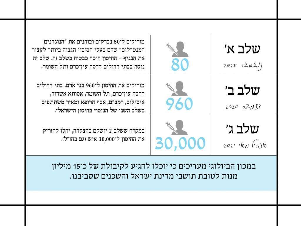 אני ממשיכה להקשות: אם אני מקבלת רק זריקה אחת, האם המשמעות היא שהחיסון הישראלי כל כך טוב שמספיקה מנה אחת? לא, מבהירים לי, את בניסוי. אנחנו בוחנים מנה אחת של מינון נמוך, בינוני או גבוה. ייתכן שיתברר שמנה אחת תספיק כדי לייצר מספיק נוגדנים ואז לא יהיה צורך במנה נוספת, אבל את זה נדע רק בעוד חודשיים.
