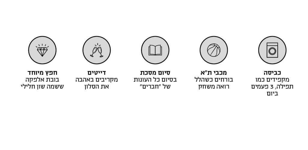 ראיונות. חוץ מהלל, כולנו גרנו יחד בדירה אחרת. כשעברנו לפה, חיפשנו עוד שותף שאפשר להכניס לדירה. עשינו יום ראיונות והגיע בנאדם שפשוט ישב ושתק על הספה. מאז אנחנו מכנים אותו הסייקו־קילר. בסוף הגיע הלל. הוא בא לשתי מטרות: הראשונה, להרים. השנייה, להוריד את ממוצע הגיל. אנחנו לא יוצאים מהדירה בלי שמוודאים שיש לו בייביסיטר.