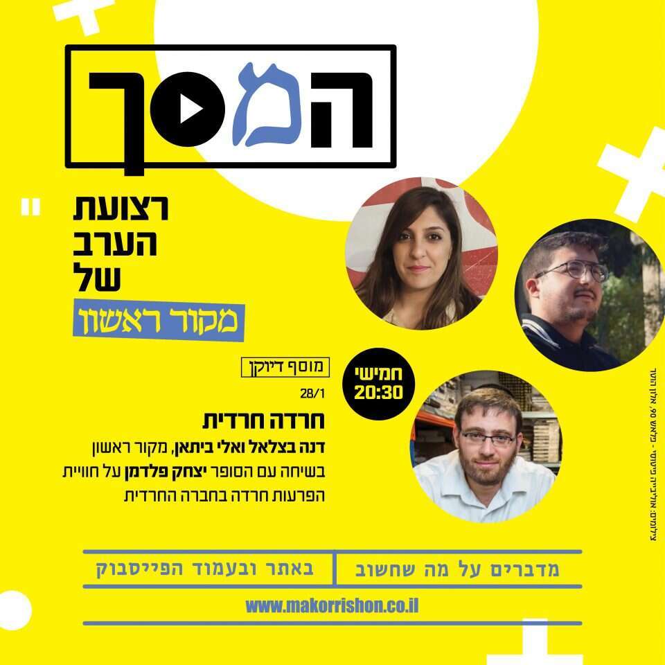 דנה בצלאל ואלי ביתאן בשיחה עם הסופר יצחק פלדמן על חוויית הפרעות חרדה בחברה החרדית. שידור ישיר בעמוד הפייסבוק ובאתר מקור ראשון.