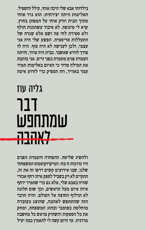 אני כותבת את הדברים הללו משום שנדמה לי שבאותו ריאיון הבחנתי לראשונה באותה חומה בצורה שבנה עמוס עוז סביב עצמו. נדמה לי שספרה של בתו גליה עוז, "דבר שמתחפש לאהבה", שראה אור לפני כשבוע, מוטט לפחות חלקים ממנה לא רק בלבי אלא בלבם של רבים, ולא רק אנשי שמאל, אלא בכלל בחברה הישראלית.