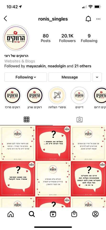 רוני שנקמן העלתה לסטורי הפרטי שלה תמונה של חבר וסיפרה שהוא רווק. היא לא ציפתה למבול הפניות שהגיע בעקבות התמונה, והתגלגל עד לעמוד ייעודי נפרד בשם "הרווקים של רוני", אליו היא מעלה תמונות ופרטים בסיסיים של רווקים עם תיוג העמוד הפרטי שלהם. משם כל המעוניין מוזמן לפנות אליהם בהודעה פרטית.