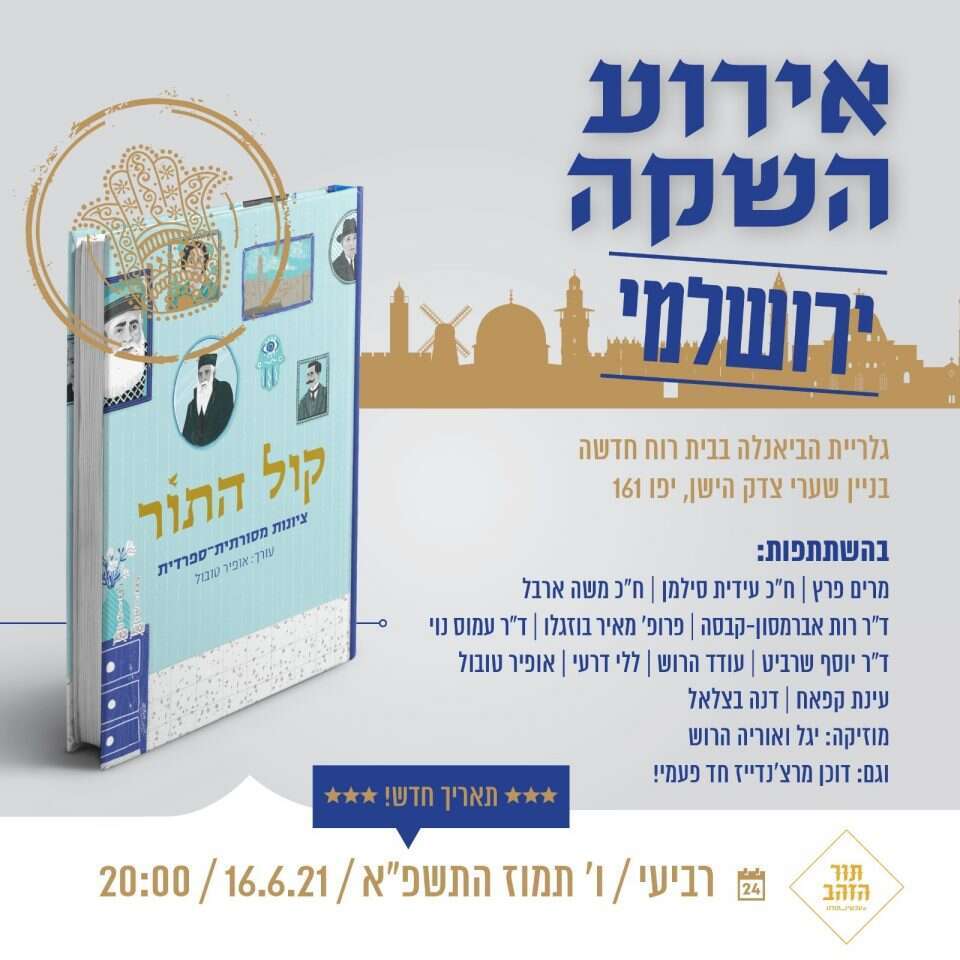הערב (רביעי) ב-20:00 בירושלים ובשידור חי באתר מקור ראשון - אירוע השקה ירושלמי ל״קול התור - ציונות מסורתית-ספרדית״ בהוצאת ידיעות ספרים.