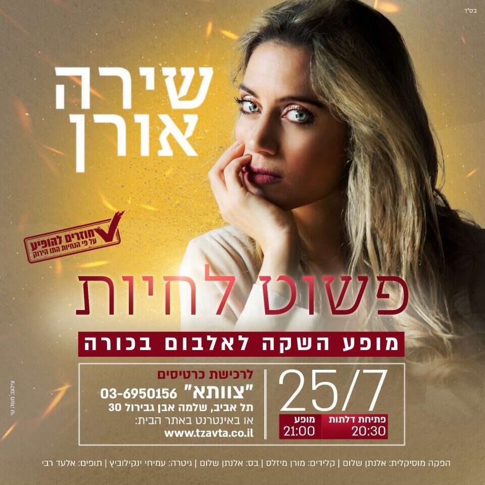 אחרי שנה וחצי שלא הופיעה, הזמרת שירה אורן מבית-אל יוצאת ביום ראשון הקרוב (25.7) בשעה 20:30 במופע השקה חדש במועדון הצוותא בתל אביב. המופע הוא לרגל הוצאת אלבום הבכורה "פשוט לחיות" והוא יתקיים עם ארבעה נגנים ובהפקתו המוזיקלי של אלנתן שלום.