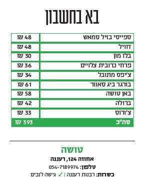 טושה | אחוזה 124, רעננה | טלפון: 054-7189974 | כשרות: רבנות רעננה | א גישה לנכים