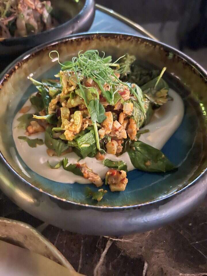 התחלנו עם קוקטיילים שכללו נגרוני חביב (האח הגדול והמריר של האפרול שפריץ) ומוחיטו ג'ינג'ר כיפי. המשכנו עם קובנה, שהייתה יותר לחמנייה משוחה בשמן מאשר מאפה הבצק התימני האהוב. ליוו אותה כמובן הצמד המתבקש - רסק עגבניות וסחוג ירקרק, ואליהם צוותה שמנת חמוצה, שפחות עבדה. לאחר הפתיחה הצולעת, הערב המריא באופן בלתי צפוי. עלו ובאו: סלט של פרוסות דקות ורחבות של זוקיני נא עם עלי נענע שהקפיצו ורעננו את המנה, וקרם פלפלים וצנוברים עטף את הירוקת. משם המשכנו לסביצ'ה פשוט מושלמת שעשו בה הכול נכון – משחק מדויק בין מרקמים, טעמים וצבעים של קוביות בס ואננס, קראנץ' מבצלצלי שאלוט, כוסברה ונענע ורוטב חלפיניו מהמם חושים. גם השווארמה דג הייתה מוצלחת וחריפה אש, עם המון־המון ירוקים, אריסה וטחינת יוגורט, והזכירה מנות מהמטבח הוויאטנמי.