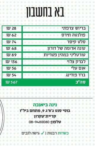נינה שוכנת באזור התעשייה של צומת ביל"ו, בין מוסכים לאולמות אירועים, ומוכיחה שאם את מספיק טובה, גם מיקום לא מאוד מזמין לא יעצור אותך. פתחנו עם לחם הבית – הכלאה בין בריוש צרפתי לקובנה תימני (וד"ש מלומינה) שהיה גוש בצק עשיר ומלא חמאה, אוורירי, רך ומענג. אפילו האלפא, שעבר לצד האפל של האבות החטובים, שבר לפטיניות למענו. טרשי הדלעת־חצילים שליווה אותו היה עמוק וחרפרף.