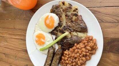 הלכנו על המנה שצדה את עינינו מיד - צ'רלס השלישי. מדובר בארוחת בוקר אנגלית שכוללת צמד נקניקיות מרגז שלא היו מספיק עסיסיות, צמד ביצי עין קלאסיות, תפוח אדמה שעבר בישול קצר ואז הועבר לתנור ליצירת קראסט פריך (והיה החלק הכי מוצלח במנה) ושעועית לבנה ברוטב עגבניות, שלמרבה האכזבה הגיעה מקופסת שימורים. עכשיו, יכול להיות ולמעשה כנראה סביר ביותר, שברחבי הממלכה המאוחדת רוב הבריטים בימינו מקצרים תהליכים ופותחים שימורים. אבל הציפייה ממסעדה היא אחרת, וקופסת שימורים היא פשוט "לא" אחד גדול, ודאי כשהיא לא משמשת בסיס להכנת תבשיל כלשהו (גם אז לא מומלץ) אלא פשוט מוגשת כמות שהיא אחרי חימום קל במיקרו. נעדרו מהצלחת כמה רכיבים כמו טוסט, פטריות או פודינג שחור אבל בגדול לגיטימי ללכת על הגרסה המצומצמת. מה שכן, חסרו לנו חצאי עגבנייה - מבושלים או צלויים, שהיו מוסיפים צבע, טעם ועניין. נקודה לזכות: סלטון עלעלים ירוקים שנשתל באירוע כנטע זר אך הכרחי (בכל זאת ישראל פה, במובן הטוב של המילה).