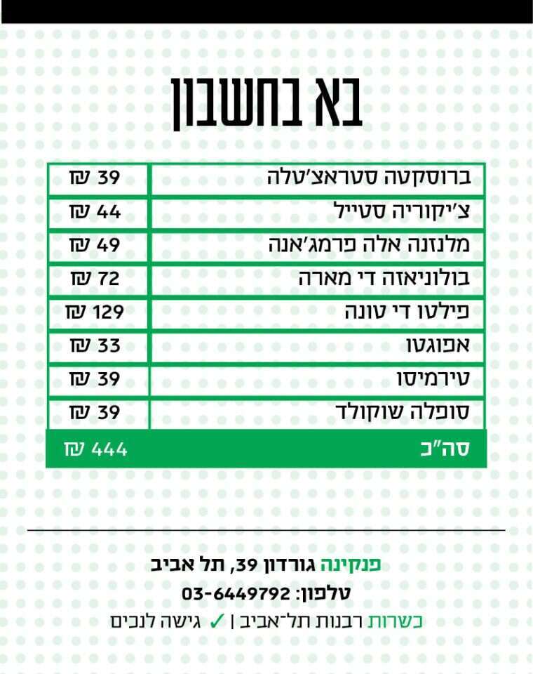אז המפות כאן הן בלבן צחור והמלצרים בכל זאת מילניאלז אבל את השיק האירופי מרגישים מהרגע הראשון וגם את היד האיטלקית של השף. פנקינה שוכנת בליבה של העיר הלבנה, בהצטלבות שבין רחוב גורדון השקט לדיזנגוף שוקק החיים (שלא נותן לאף איום ביטחוני לנצח אותו).
