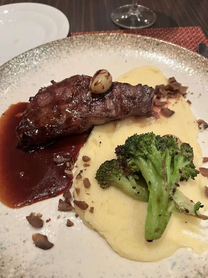 מאגף הבשר ניסינו את "סטייק האנטרקוט מפרה שמנה" (תהיתי אם הפרה יותר מוחמאת או נעלבת). הנתח היה איכותי ועסיסי ויספק כל קרניבור וגם מידת העשייה תוזמנה היטב. הוא הוגש ברוטב יין ובצלצלי שאלוט מזוגגים, לצידו קרם תפוחי אדמה וכמה פרחי ברוקולי מאודים. בסך הכול מוצלח. הלכנו גם על דג - פילה מוסר ים שנצלה על הפלנצ'ה. הוא הוגש עם טורטליני מעל קרם פלפלים מותססים וזה נראה מצוין כשהגיע לשולחן אבל אכזב כשנגסנו בו. הדג היה יבש וחסר טעם ואותו תיאור אפשר להעניק גם לפסטה במילוי קרם תפוחי אדמה וחרדל.