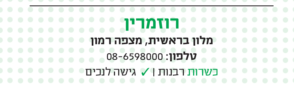 הצירוף "מסעדת שף" ו"דרום הארץ" הוא כמעט אוקסימורון. ההיצע הדל מרגע שעוברים את גדרה מלמד כי לרוב יהיה מדובר במסעדה בתוך מלון. כבר סקרנו כאן בהרחבה את מסעדת "ערמונים" מגבעת־יואב (שמתארחת במלון "דרים איילנד") וכעת שמנו פעמינו אל הדרום העמוק – מצפה רמון ומסעדת "רוזמרין" ששוכנת ב"בראשית". בניגוד למסעדות המלון התל־אביביות, כמו למשל אלו שרחוב הירקון משופע בהן אשר עומדות בזכות עצמן, כאן זוהי מסעדה שלפני הכול משרתת את אורחי המלון, אך בהחלט פתוחה גם לקבל סועדים מבחוץ בהזמנת מקום מראש.