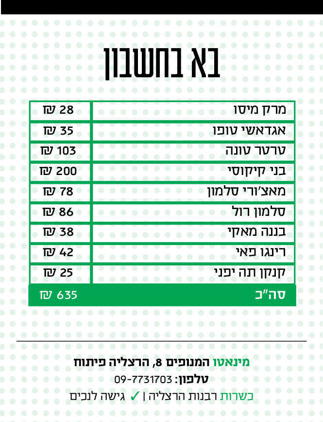 אין הרבה מסעדות שמצד אחד פועלות שנים רבות ומצד שני עדיין נחשבות למעין סוד שמור. "מינאטו" החלה את דרכה לפני 16 שנים בתחנת דלק בקיסריה, אבל דווקא השלוחה ההרצליאנית, שנפתחה שנתיים לאחר מכן באזור התעשייה ההייטקיסטי שם, הפכה למקום עלייה לרגל של יפנופילים.