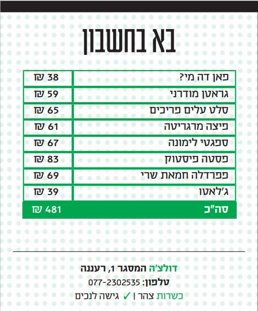ממוצ'ה ועד פרינו, מבזיליקה ועד קאנוטו - הפיצה הנפוליטנית כובשת את ישראל. אפשר לדבר על "לה פיאדרה" הירושלמית, שרק לאחרונה נבחרה בידי מדריך Top 50 Pizza המוערך (המכונה גם "המישלן של הפיצות") לאחת מהפיצות הטובות בעולם ורשמה כניסה ראשונה אי פעם של פיצרייה ישראלית (וכמובן גם כשרה). אחת מהפיצריות המדוברות של השנים האחרונות היא "דולצ'ה", שיושבת באזור התעשייה של רעננה. לאחרונה היא הרחיבה את התפריט והפכה אותו לכשר, כך שכעת הוא כולל מנות ראשונות ופסטות ומשמש למעשה כטרטוריה.