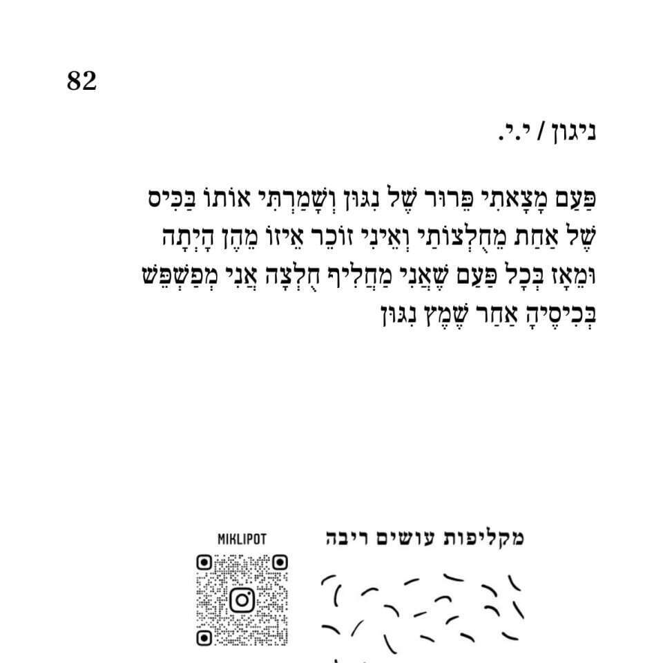 המדבקות הלבנות האלה, או "הקליפות" כמו שהקבוצה קוראת להן, חתומות רק בראשי תיבות ובלוגו הקבוצה. בפינה השמאלית של כל מדבקה מצוין גם המספר שלה, לפי סדר הדפסתן. לא מזמן חגגה הקבוצה את הקליפה המאה. "היא ריקה", היא מראה לי את הקליפה. "כאן במפגש אנחנו מביאים עטים ונותנים לאנשים לכתוב. גם ברחוב הדבקתי אותה עם עטים, ואנשים כתבו את הקליפה שלהם. אנחנו בעד שיתופיות. ובערבי שירה יש מפגש עם הקהל וגם עידוד של הקהל לכתוב".