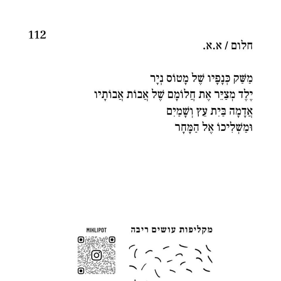 אילה: "הפרויקט שלנו תפס בזמן האחרון משהו קצת יותר מובנה. קיבלנו תקציב ממפעל הפיס, והוא יממן את הגיליון הבא של כתב העת, והשאיפה היא להמשיך להוציא עשרה שירים בחודש ופעמיים בשנה לאסוף את השירים לכתב עת עם מדבקות תלישות. אז חוץ מזה שנמשיך לכתוב הרבה יחד, הפנטזיה הבאה שלנו היא לתרגם את המדבקות לערבית ויידיש, כי אנחנו בכל זאת יוצרים ירושלמים. הדבקנו בתל־אביב, בבאר־שבע ובצפת, אבל בסוף ירושלים היא המרחב שלנו וזאת עיר גדולה ומגוונת וצבעונית. אנחנו רוצים לדבר בעוד שפות ולהנגיש את השירה לעוד אוכלוסיות, מתוך הרגישות המתבקשת".