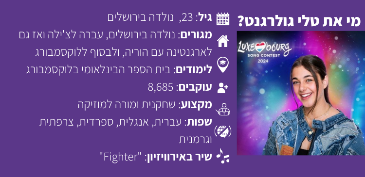 בעוד הסיכויים של ישראל טובעים עוד ועוד בבוץ הפוליטי העכור של התחרות, מעבר לים נרשמה גאווה אחרת כשבלוקסמבורג נבחרה אמש הנציגה לאירוויזיון, והיא ישראלית מכף רגל ועד ראש. שמה הוא טלי גולרגנט, בת לאם ישראלית ואב יהודי מפרו שהחליטו להשתקע במדינה הקטנה הגובלת בבלגיה, גרמניה וצרפת.