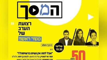 המסך: תמר פרלשטיין (עורכת מוצש), לבנת בן חמו (גלגלצ) ויקי הפשטיין (מנהל הדיגיטל של מקור ראשון) בשיחה על מיעוט הנשים ברשימת 50 המשפיעים של מוסף מוצש